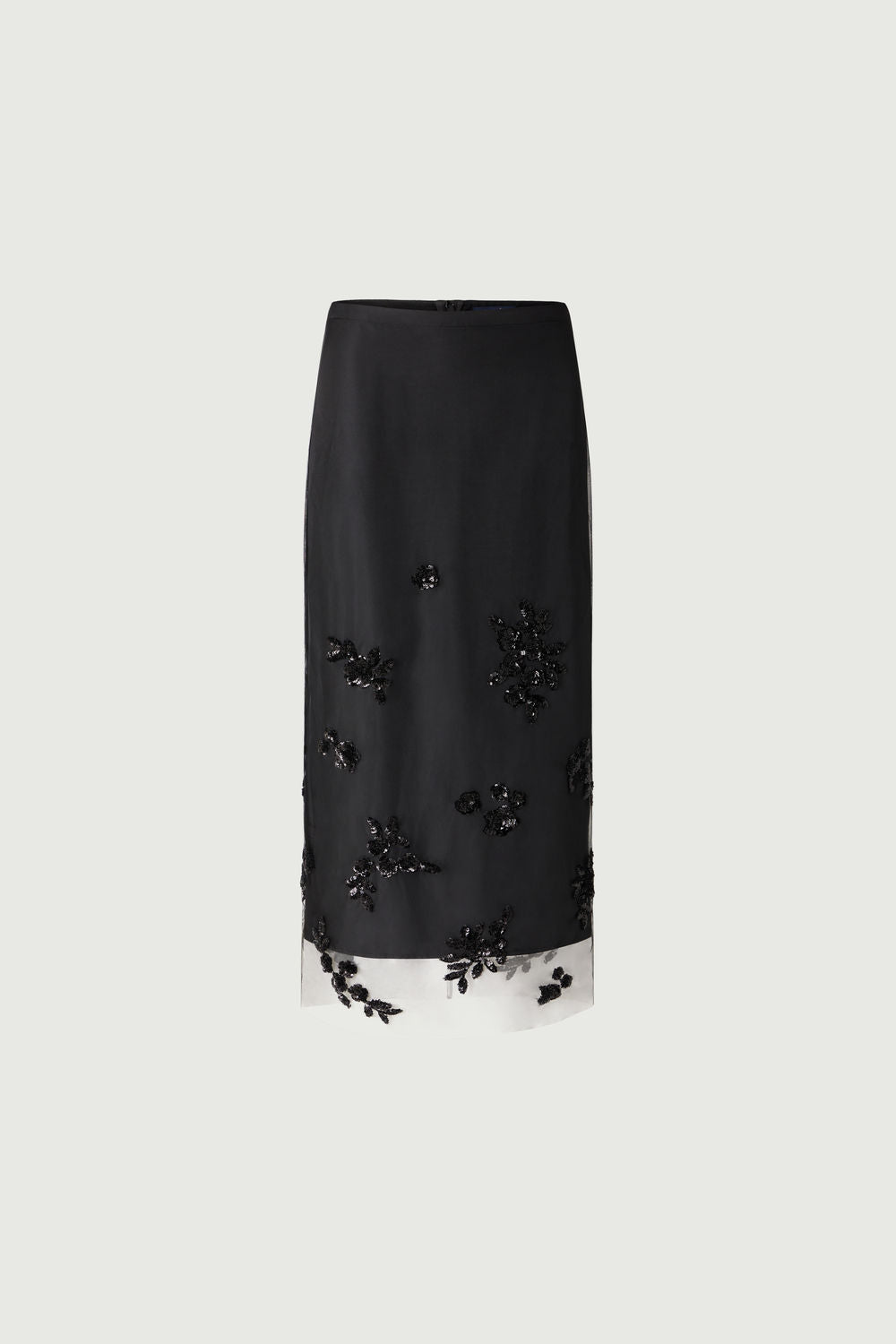 GRACE is an elegant long skirt in tulle and embroidery appliqués. Made in two parts: a lining underskirt to limit transparency, and a black tulle skirt over-embroidered with black sequined floral elements from bottom to top. It fastens with two invisible zips. Versatile, this skirt can be worn with or without its petticoat, depending on how daring you are.